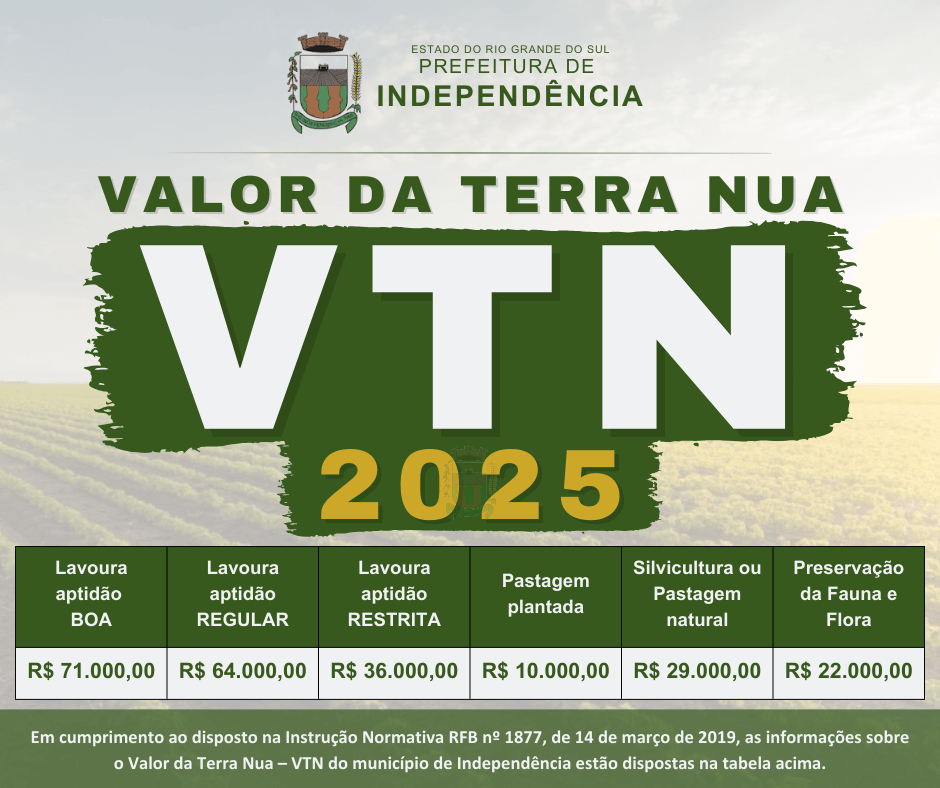Em cumprimento ao disposto na Instrução Normativa RFB nº1877, de 14 de março de 2019, as informações sobre o Valor da Terra Nua – VTN no Município de Independência para o ano de 2025 estão dispostas na tabela a seguir: